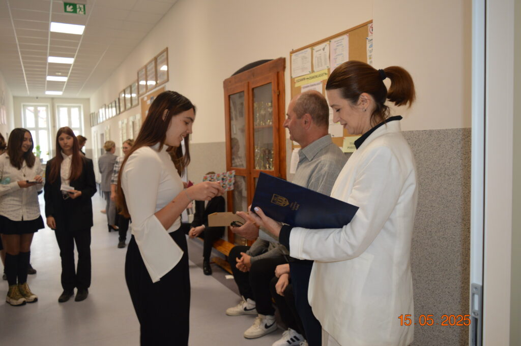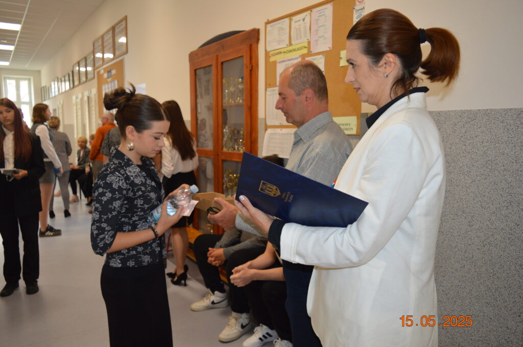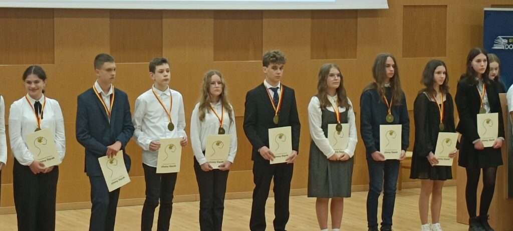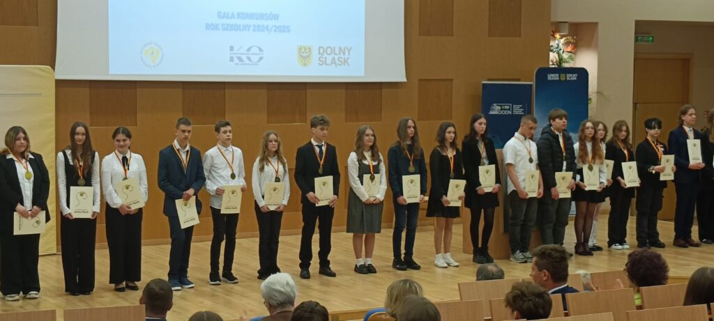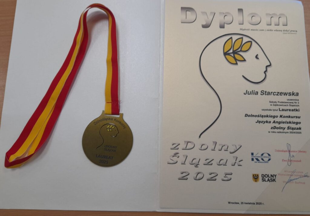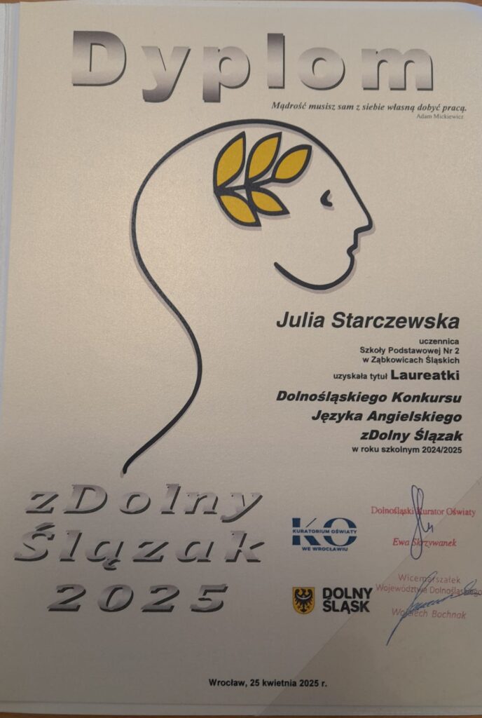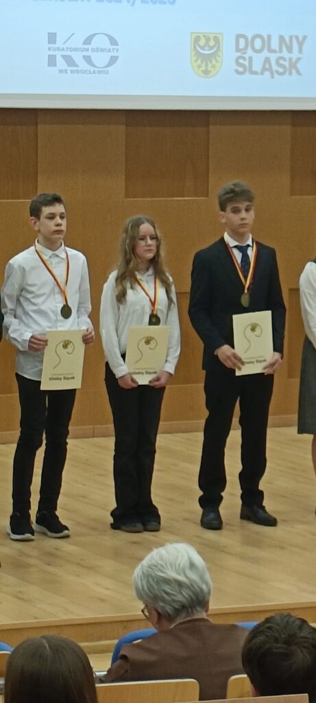 W piątek, 25.04.25, w auli im. Jana Pawła II na Uniwersytecie Przyrodniczym we Wrocławiu odbyła się uroczysta Gala Laureatów prestiżowego konkursu zDolny Ślązak. Tegoroczna edycja zgromadziła ponad 50 tysięcy uczniów z 600 szkół z województwa dolnośląskiego. Nasza uczennica- Julia Starczewska z kl. 8b, laureatka konkursu z języka angielskiego- odebrała z rąk Dolnośląskiej Kurator Oświaty- p. Ewy Skrzywanek- dyplom i medal laureata. Należy wspomnieć, że Julia uzyskała w etapie finałowym 91% punktów .