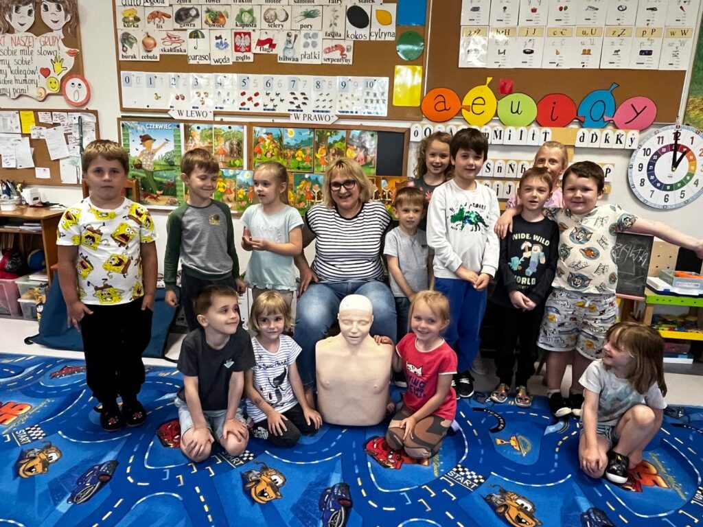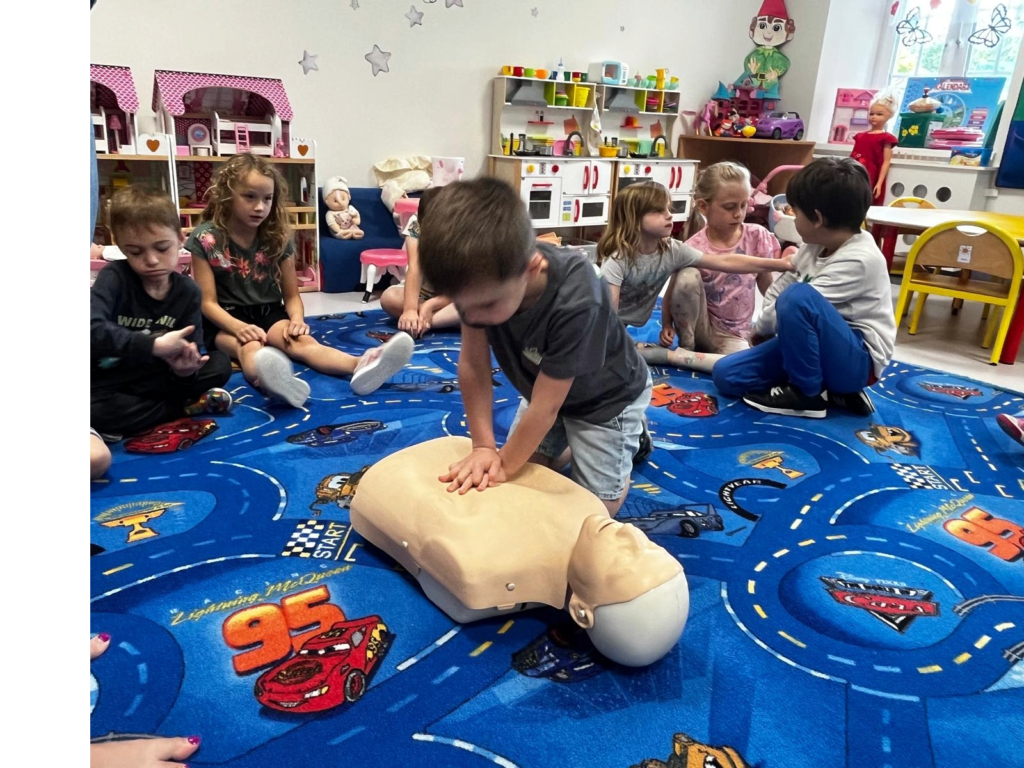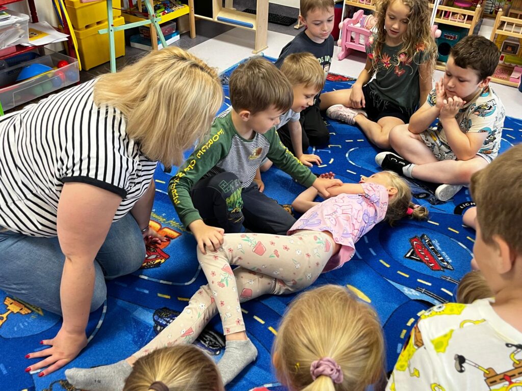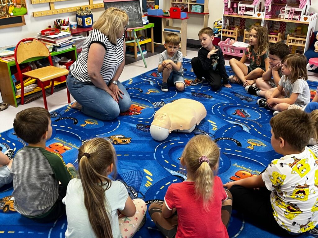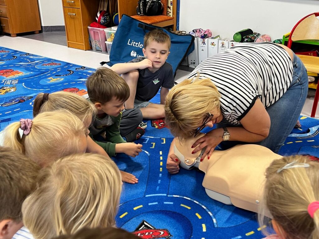 W naszym przedszkolu miały miejsce bardzo ciekawe zajęcia z zakresu pierwszej pomocy. Pani Magdalena Kolanko w sposób bardzo przystępny i obrazowy udzieliła przedszkolakom wskazówek, jak pomóc sobie i innym w różnych codziennych sytuacjach przy małych wypadkach jak i tych, zagrażających życiu. Ćwiczenia praktyczne również mamy za sobą.