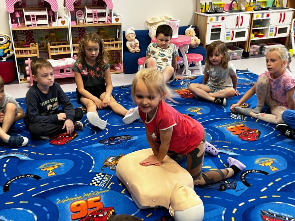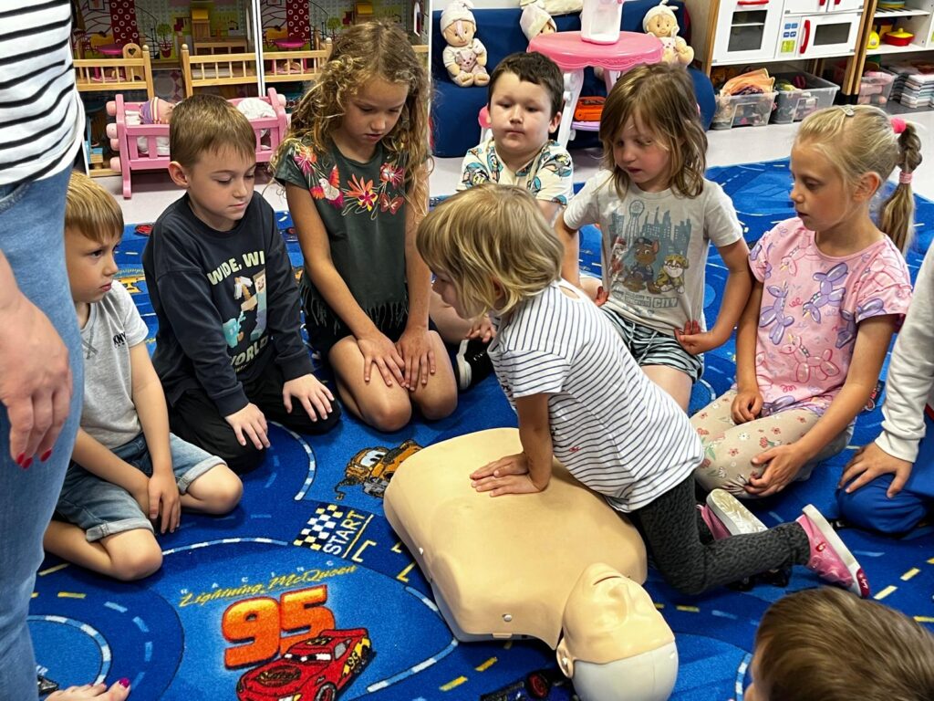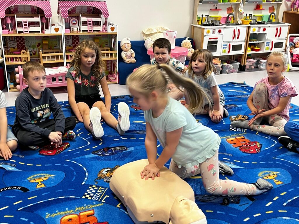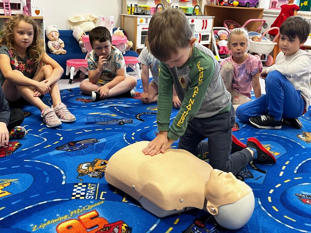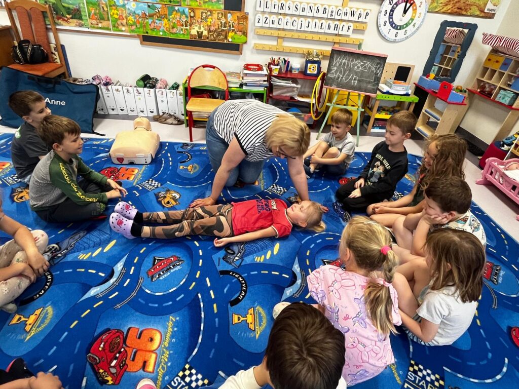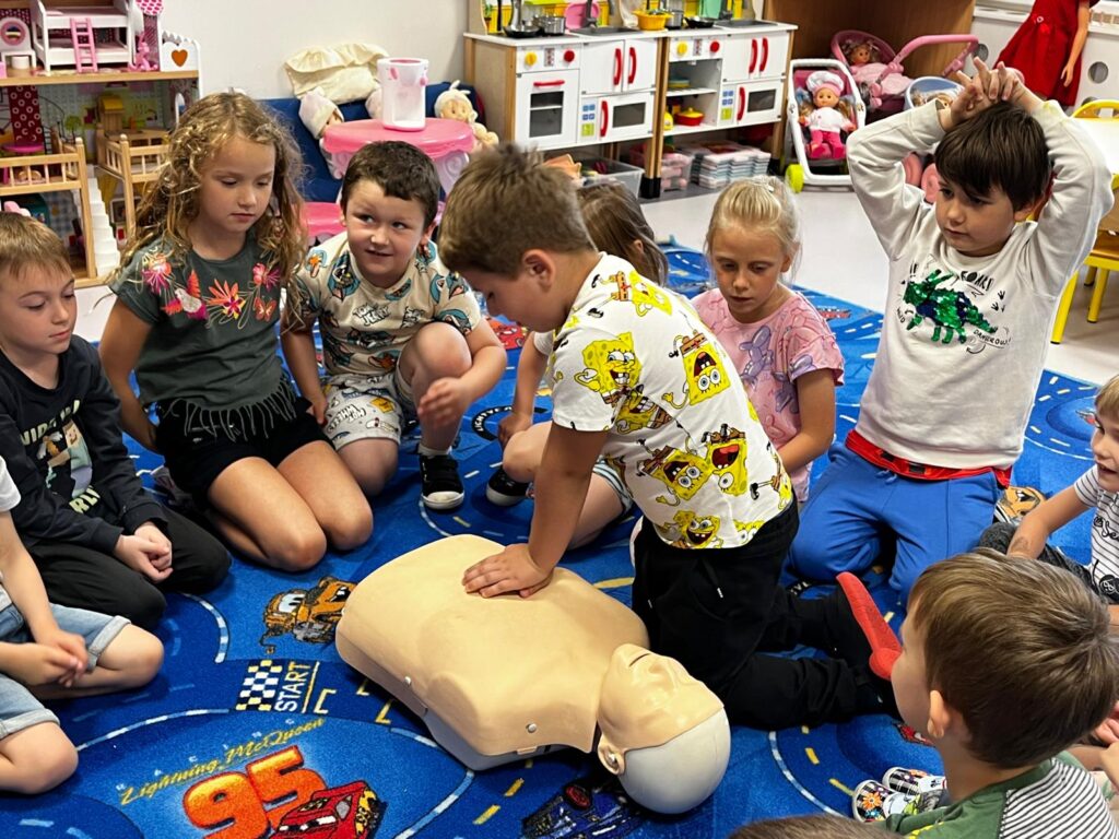 W naszym przedszkolu miały miejsce bardzo ciekawe zajęcia z zakresu pierwszej pomocy. Pani Magdalena Kolanko w sposób bardzo przystępny i obrazowy udzieliła przedszkolakom wskazówek, jak pomóc sobie i innym w różnych codziennych sytuacjach przy małych wypadkach jak i tych, zagrażających życiu. Ćwiczenia praktyczne również mamy za sobą.