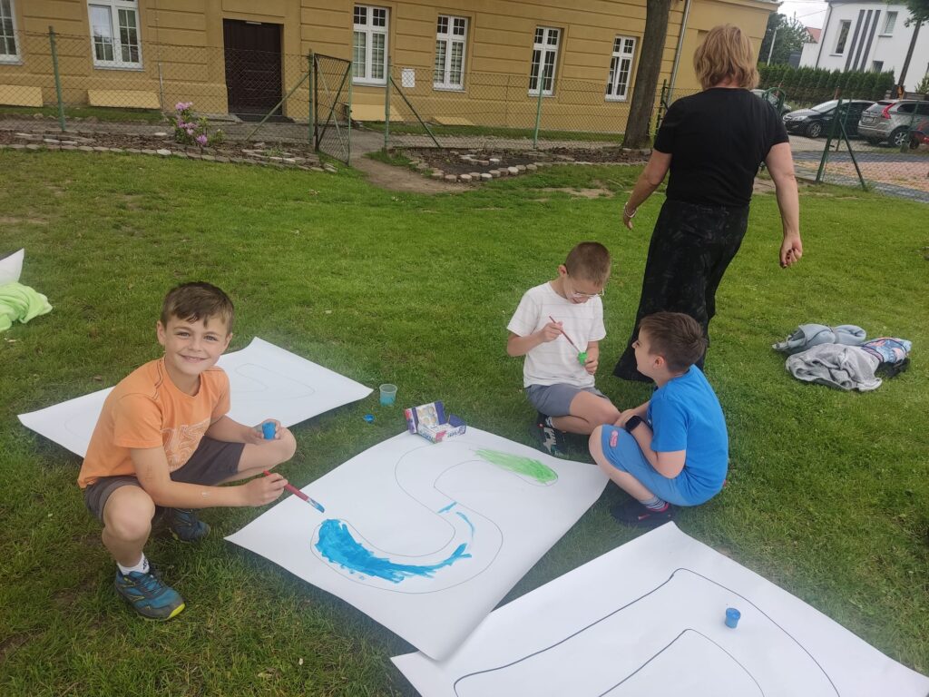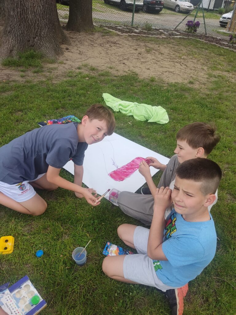 Następnie uczniowie udali się do naszej szkoły na zajęcia sportowe i warsztaty artystyczne (malowanie koszulek). Około godziny 17.00 na teren szkoły wjechała Ochotnicza Straż Pożarna z Tarnowa. Strażacy przeprowadzili z uczniami zawody i zabawy z zakresu pożarnictwa oraz ratownictwa medycznego. Uczniowie mieli również możliwość skorzystania z zabawy w kulach zorbingowych. Przygotowaliśmy również wspólnie piknik z grillem, pieczeniem kiełbasek, przekąskami. Spotkanie skończyliśmy w godzinach wieczornych.