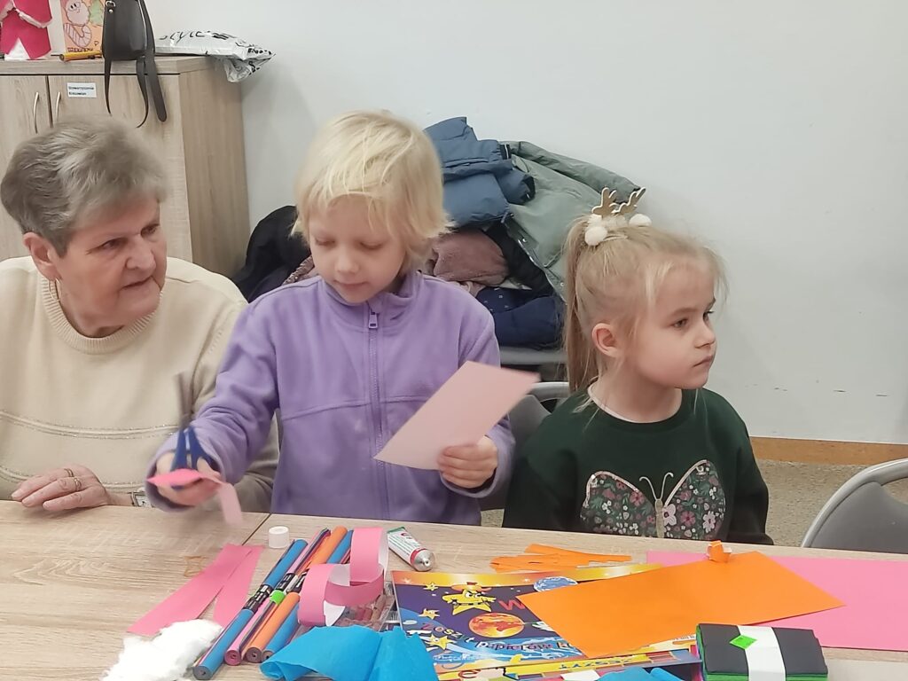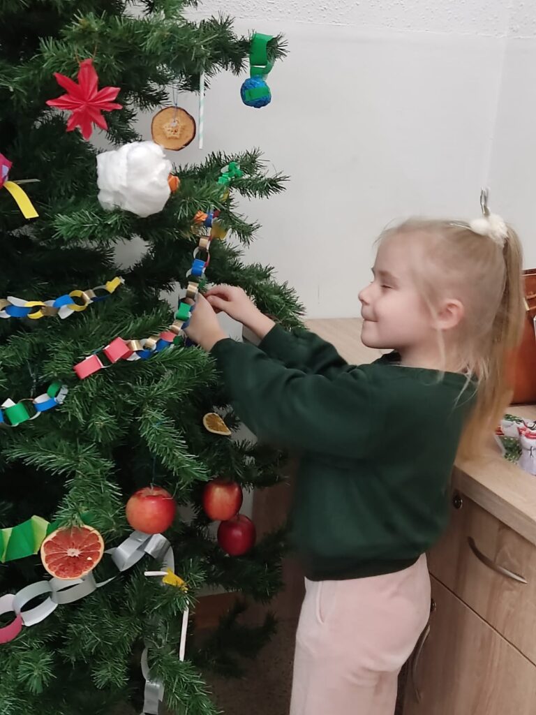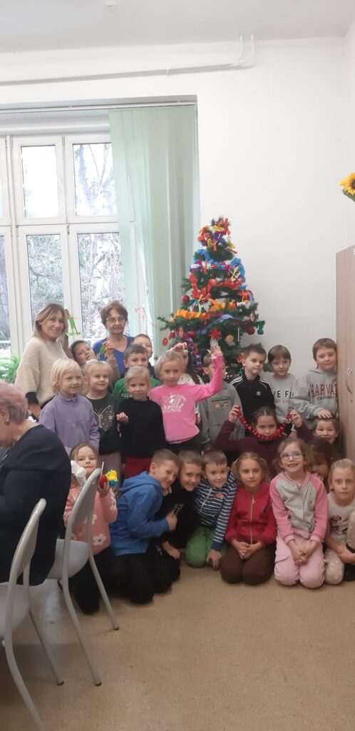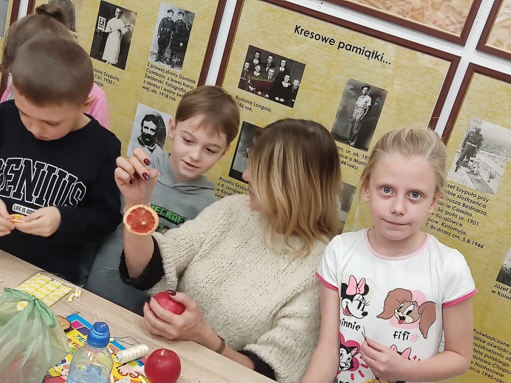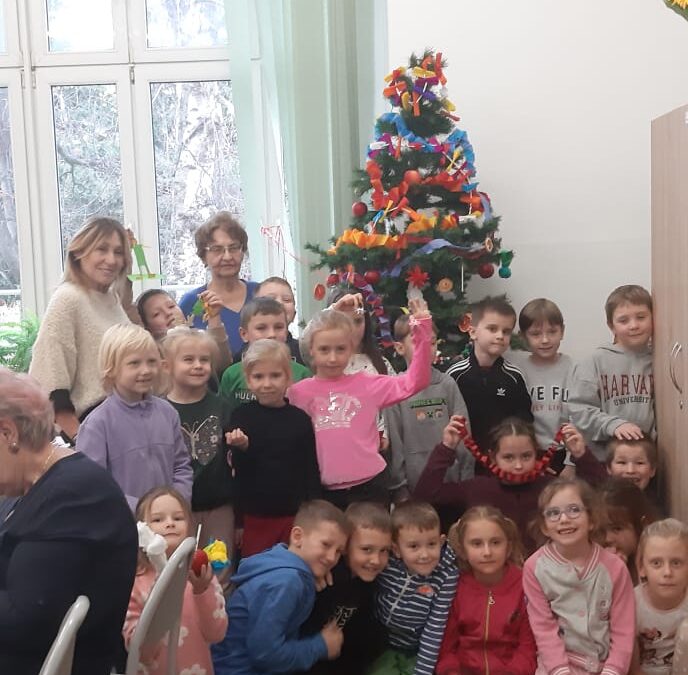 1 grudnia dzieci z klasy 1A brały udział w warsztatach pod hasłem „Zabawki na choinkę z dawnych lat ’. Panie ze Stowarzyszenia Kresowian zaprezentowały przykładowe dekoracje. Dzieci z dużym zaangażowaniem tworzyły swoje ozdoby: łańcuchy, Mikołaje, gwiazdki. Potem wspólnie ubrały choinkę. Była to ciekawa lekcja historii i sztuki ludowej, która wprowadziła uczestników w świąteczny nastrój.